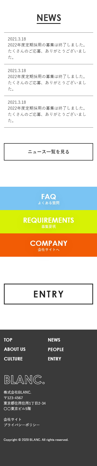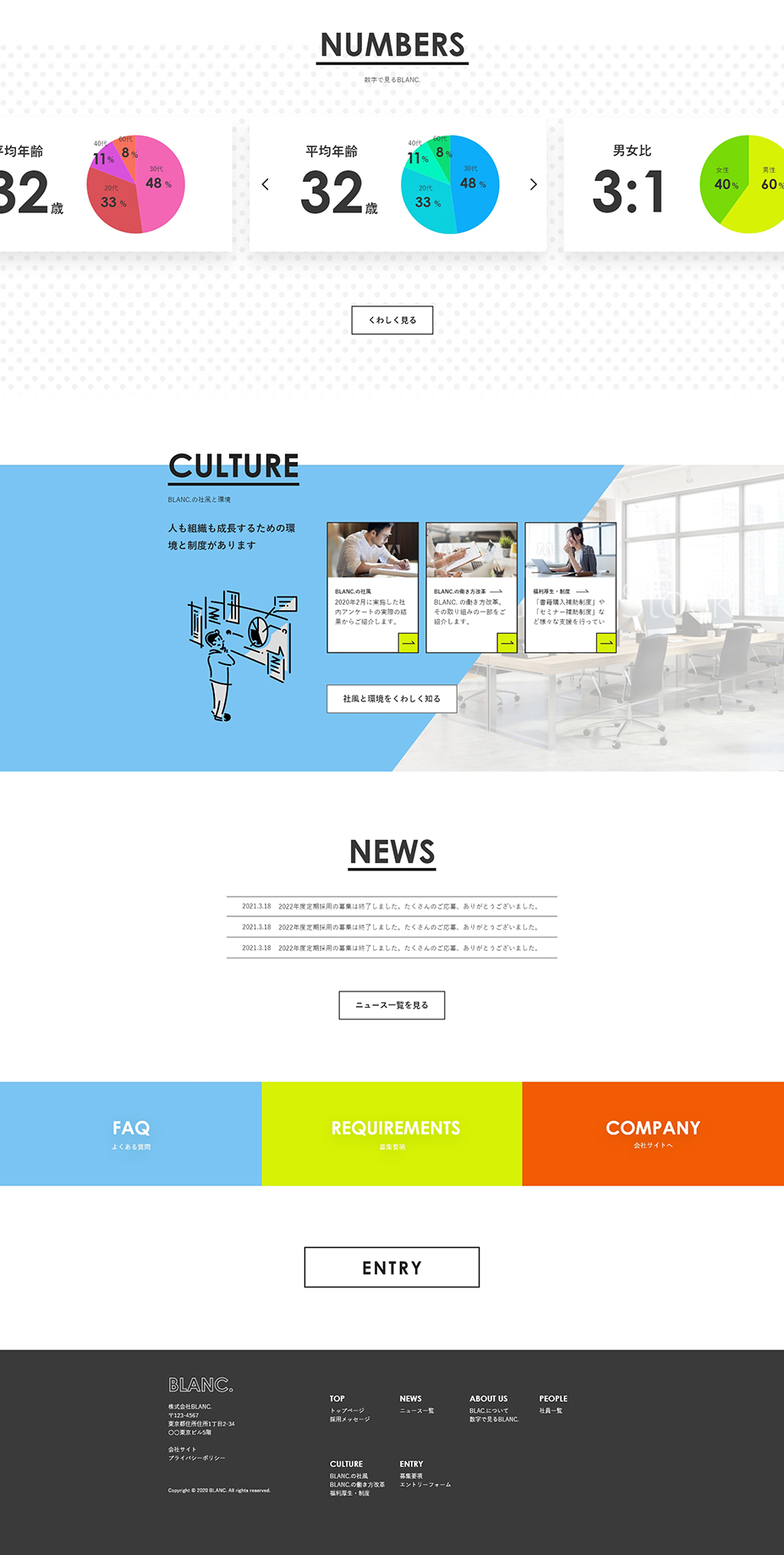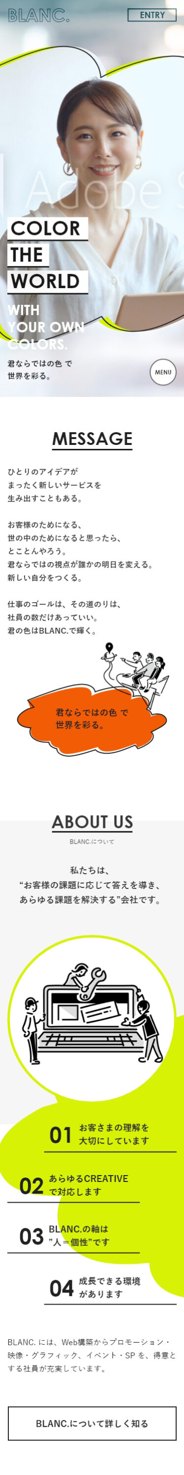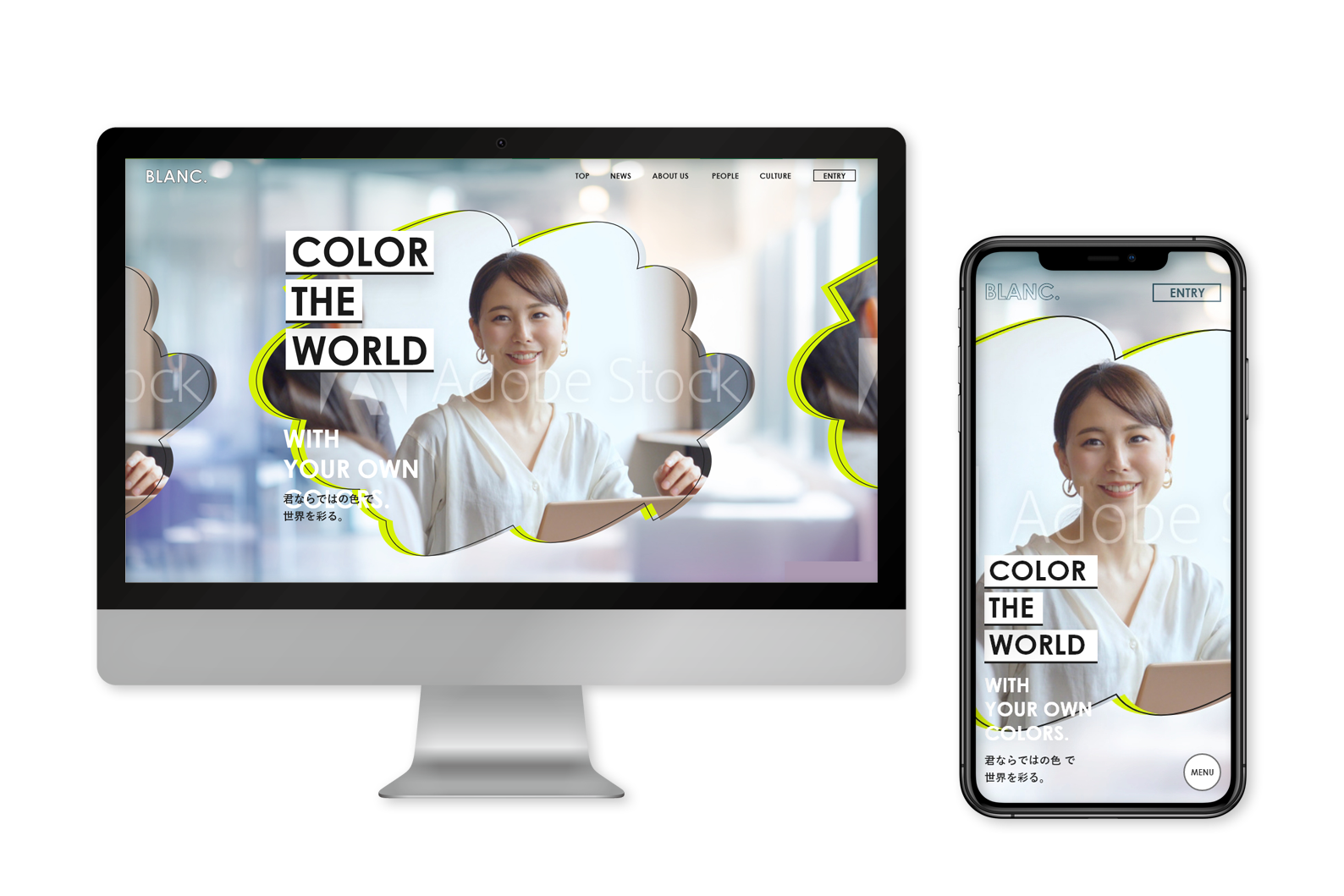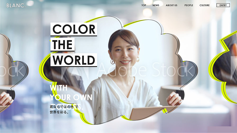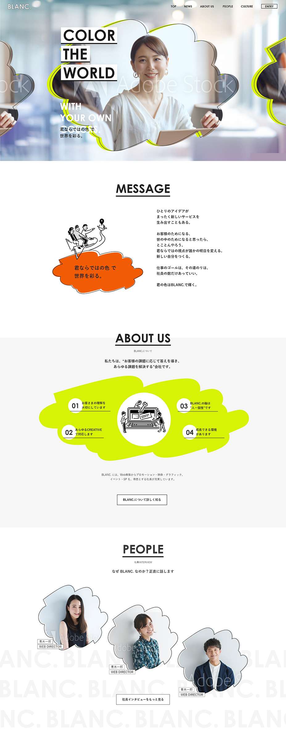 制作会社の採用サイトのWEBデザイン例です。コンセプトの「君ならではの色で世界を彩る」から、ペイントしたような形や、ビビッドな色合いを使用し、適度にエッジの効いたサイトにいたしました。